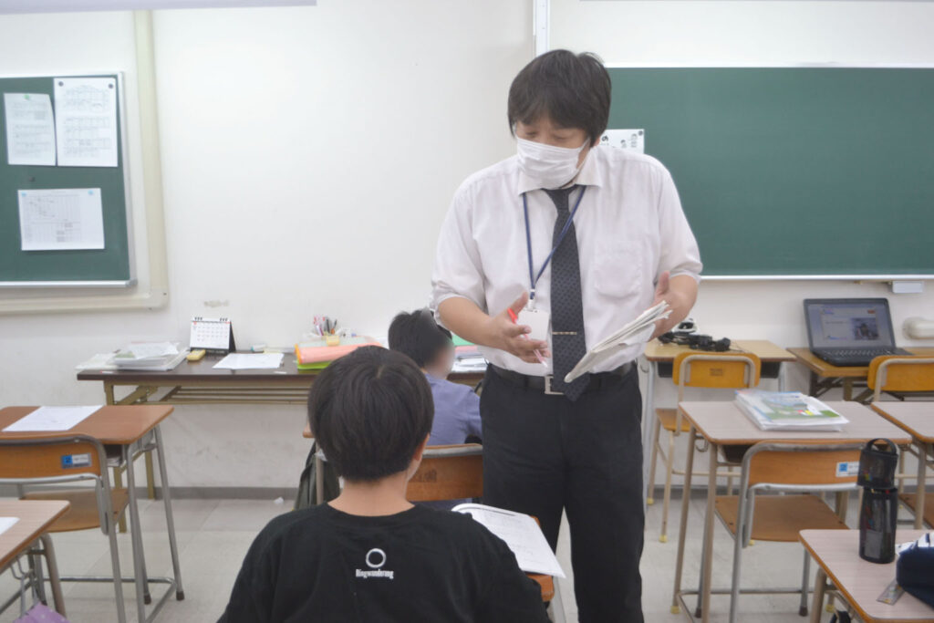 通常授業では、定期テストでの点数にこだわり、加茂名中学校の進度に合わせた授業を行っています。学校進度より2週間~1ヶ月の先取り学習をして、直前の授業を定期テストの対策に当てることで、重要な項目や苦手な単元の解消に努めています。また、単なる暗記にとどまらない「理解力」「思考力」「表現力」を育てる教材を使用し、「資料を読み取って説明する力」や「自分の意見を根拠とともに述べる力」も強化します。