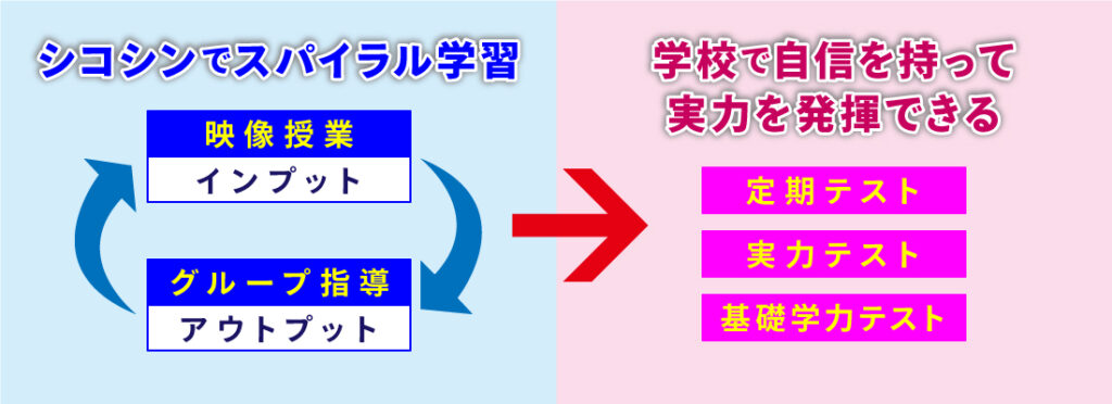 学校で学習した単元を、次は四国進学会で復習するステップです。生徒一人ひとりに合わせて、基本的な問題から応用問題まで幅広く演習することで着実に定着させることができます。